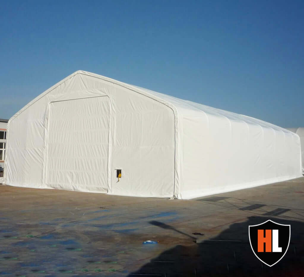 To best suit the natural landscape, the double trussed storage tents are available in white, light grey, dark grey, grass green, and military green. Tents with mixed colours – white with green trim, white with grey trim, and white with blue trim – are also available.