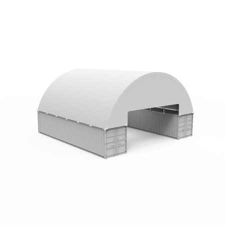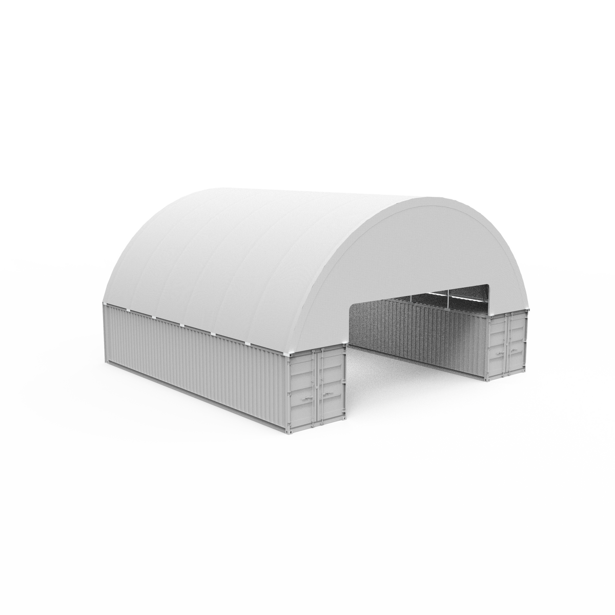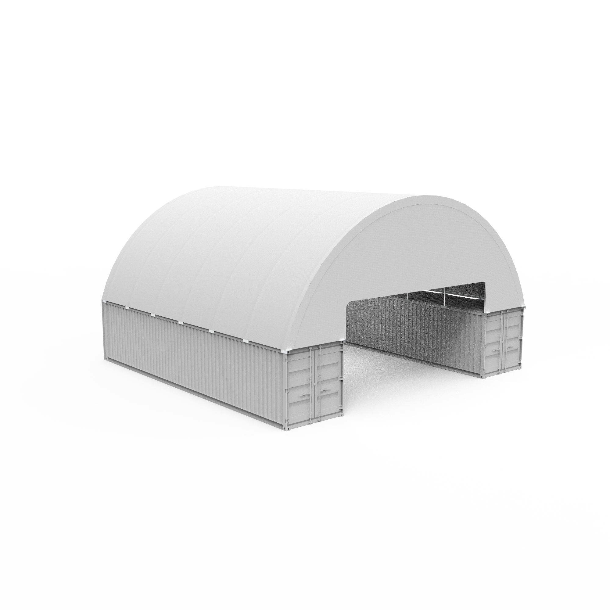 The C4040N container shelter comes with additional lower and upper standing legs, base plates, and tension tubes on the inner edge, with the frame mounted on the outer edge of the shipping containers. This model also boasts of a roof cover that extends to the front.