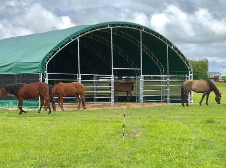 To best suit the natural landscape, the double trussed livestock shelters are available in two colours – grass green and military green.